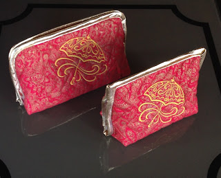 Red quilted shell pouches / cosmetic bags with embroidered umbrella and gold trimming, has 2 clear vinyl pockets with decorative zippers and pullers, two invisible sew-in magnetic closures. Medium size is 5 1/2" x 9" and small size is 5 1/2" x 7".